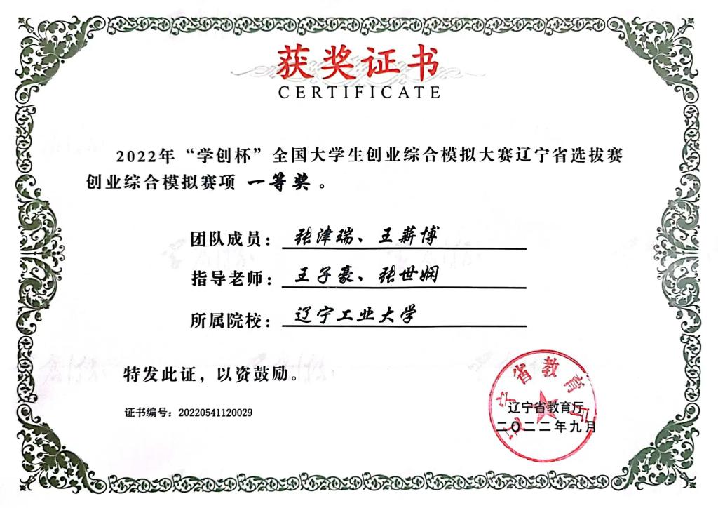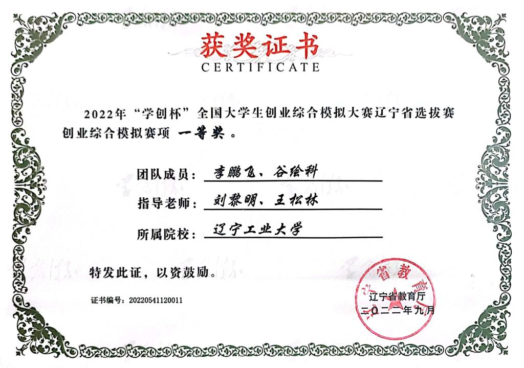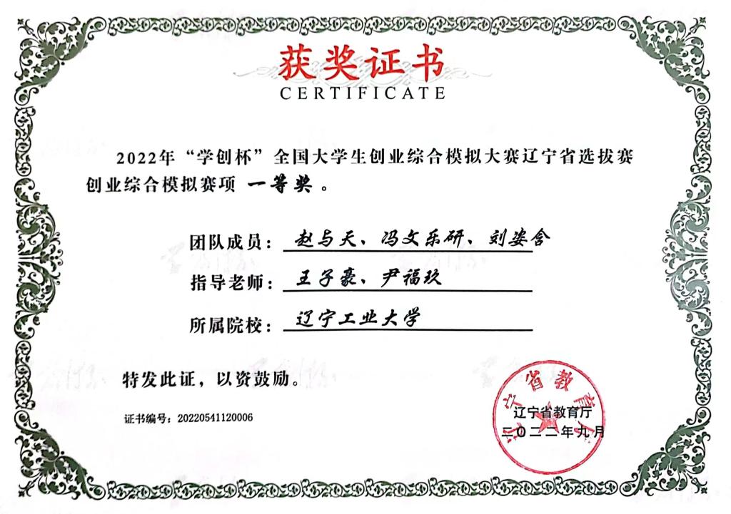 2022年“学创杯”全国大学生创业综合模拟总决赛成绩公布。自2022年1月启动以来,共有1458所高校、10万多支队伍、30万名师生积极参与。我院学生赵与天、冯文乐研、张津瑞、李鹏飞、刘姿含、谷绘科、王薪博组成的三只队伍,在尹福玖、王玉、王子豪等老师的精心指导下,历经半年时间,在校赛的三十支队伍中以包揽前三名的成绩闯进省赛。在2022年6月12日举办的省赛中,再次让辽工大成为唯一一所辽宁省内主体赛三组同时获得一等奖的学校。最后在国赛期间,我院学生赵与天为队长,冯文乐研、王薪博三名学生通过9个小时激烈角逐并脱颖而出斩获全国总决赛一等奖,再次刷新我院及我校参加此项活动的最好成绩。